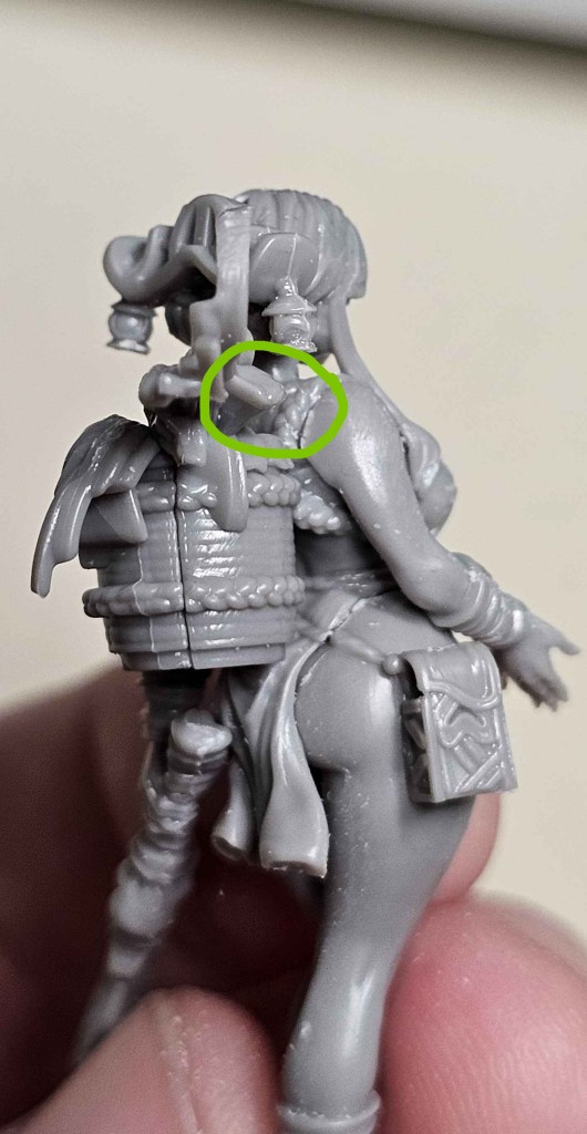 The basket is pretty simple, though figuring out where the flower goes was a bit of a puzzle. It fit easily, but I’ve circled the stem to help with guiding. Glue the basket sides together, then attach to the divot on her back, and place the flower head on the stem.